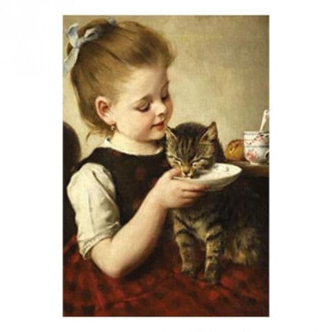 | 猫にミルクをあげている少女とのコントラストが微笑ましい、大変心温まる作品。猫好きの方向けの絵柄です。 |