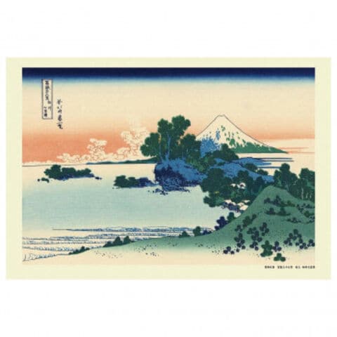 | 七里ヶ浜の北にある鎌倉山と呼ばれる丘あたりから、小動岬の向こう側に富士山を望む絵図です。モクモクとした入道雲が遠景の空に見えます。左端の島は江ノ島かと思われます。夏の雲の中に雪化粧の富士山とはやや矛盾もありますが、実際の景色よりもデザイン性を重視したものであると考えられます。人物も描かれておらず、北斎にしては珍しい純風景画と言えます。 |