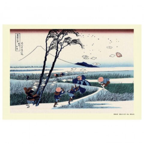 | 葛飾北斎の代表作「富嶽三十六景」の駿州江尻です。風という目に見えないものを大変リアルに描くという、北斎の才能が発揮された作品です。ここでは御高祖頭巾を被った女性の持つ懐紙が風に抜き取られて舞い上がり、笠を飛ばされた旅人など突風にうろたえる人々と不動を感じさせる富士との対比が見事です。風に揺れる草は、一本一本彫師によって彫られた線であり、大変細かい仕事が要求されます。 |