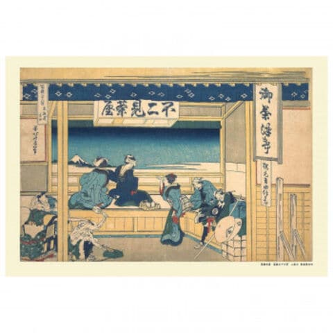| 葛飾北斎の代表作「富嶽三十六景」の東海道吉田です。現在の愛知県豊橋市にあった東海道の吉田宿は吉田城の城下町。富士山の眺望が自慢の「不二見茶屋」での旅の人々が描かれます。右にある看板には「お茶漬け」と吉田名物「ほくち(火打石で起こした火種を大きい炎にする燃えやすい乾燥植物)」も商っているようです。 |