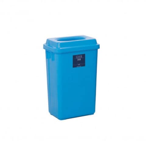 | 投入口が小さいブルーのゴミ箱です。市販の45L用ポリ袋が使用できます。製品重量の60%に再生素材を使用しています。 |