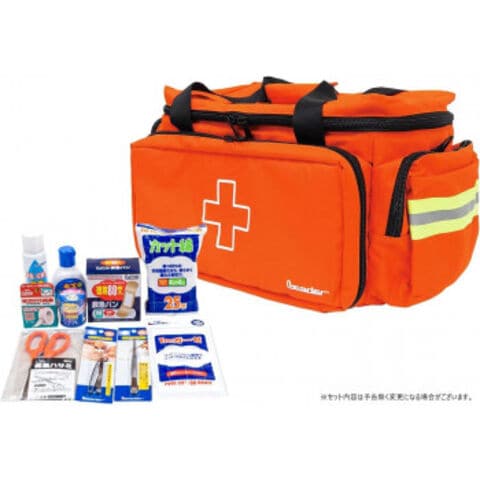 セット内容救急バッグ、LEカット綿25g【4×4cm】、LEガーゼ1m【30cm×1m】、エルモサージカルテープ12.5mm×9m、ププレ伸縮包帯M【5.0cm×4.5m】、エルモキズ洗浄消毒液80ml、エルモ手指・皮膚の洗浄消毒スプレー83ml、エルモ救急バンMサイズ80枚入、LE衛生ピンセット12.5cm、LE毛抜き・マユ毛抜きセット、万能ハサミ16cm(各1個)