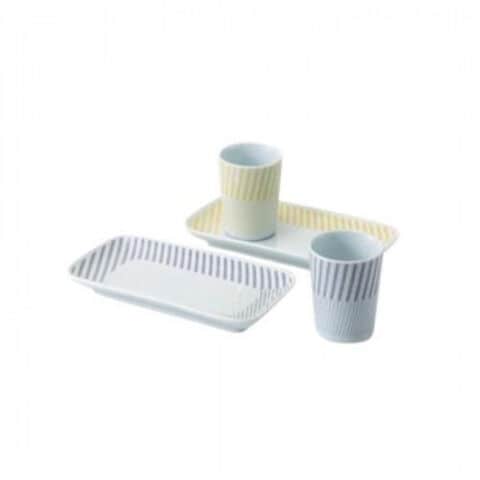 | 軽やかなパターンと色調の長角トレーとミニカップのセット。モーニングメニューやランチメニュー、ティータイムのケーキセットなどフレキシブルに使えます。 |