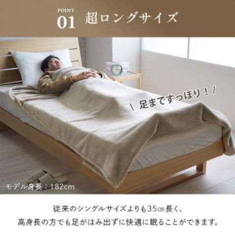 | 高身長の方向け、頭まですっぽり包まれて眠りたい方向けに従来のシングルサイズよりも35cm長い毛布をつくりました。肌に触れる表地にはふんわりやわらかくあたたかなフランネル素材を使用しています。洗濯機で丸洗い可能(ネット使用)で、いつでも清潔にご使用頂けます。 ※画面上のカラーはご使用ブラウザやモニターの設定により、実物とは若干異なる場合がございます。 |