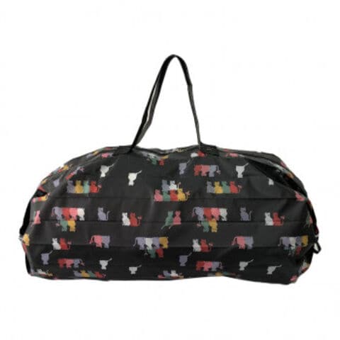 ねこ柄のプリントが人気!アコーディオンのように生地が折り重なり、コンパクトなのに容量もたっぷりあるので、レジカゴバッグとしてなど普段のお買い物にも十分使えます。両サイドにゴムが付いていますので、使用しない時はクルクル丸めてゴムで留めるだけでコンパクトに収納できます。