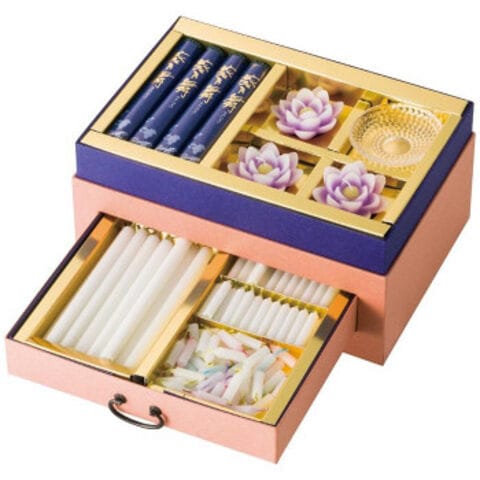 | 生産国 | 日本製:ガラス・線香、ベトナム製:蓮ローソク・五色蝋燭、マレーシア製:菜100・菜15、中国製:燭台 |