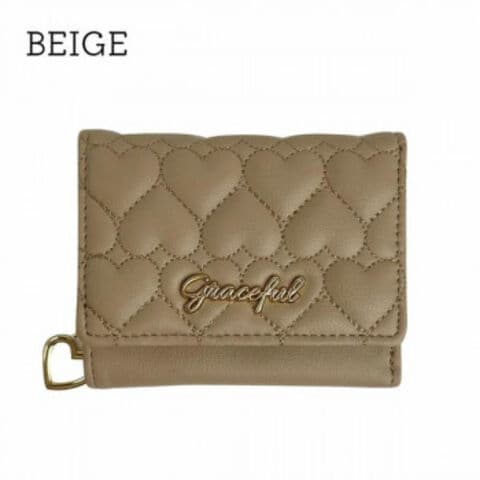 英字ロゴのプレートと、ゴールドハートの引手が付いた折財布。手触りのいいぷくぷくハートのキルトが可愛い。仕切りの付いたコインケースはハート金具の引手付き!大人可愛いデザインに仕上がりました。3つ折りタイプでミニバッグにもスッポリ収まるコンパクトサイズ!小銭入れはジッパー開閉で仕切りがあるので、小銭を整理しやすい仕様です。
