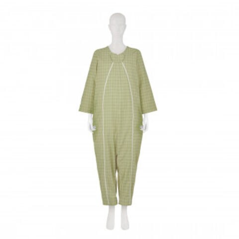 ご本人では開けにくいアイデアホックを使用した介護用つなぎねまき。アイデアホックが表から見えないデザインを採用。股部分にもファスナーを配置。おむつ交換がしやすいように股ファスナーを配置。寝たきりの方や拘縮がある方にも着せやすい設計。