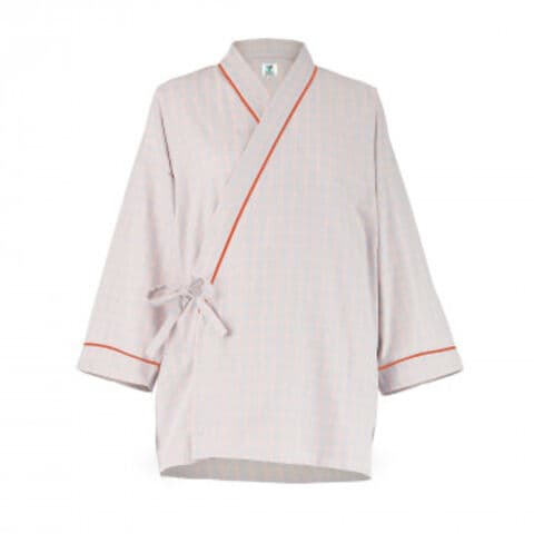 | 動きを妨げない、ゆったりとした作り。着替えがしやすく、診察時にも便利な前開き。首廻り、袖口、パンツ裾のテープの色でサイズを見分けられます。どなたにでも似合う、清潔感のある色合いのチェック柄。 |