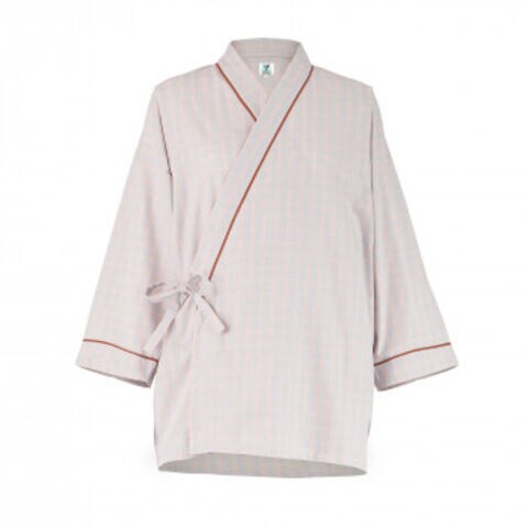| 動きを妨げない、ゆったりとした作り着替えがしやすく、診察時にも便利な前開き。首廻り、袖口、パンツ裾のテープの色でサイズを見分けられます。どなたにでも似合う、清潔感のある色合いのチェック柄。 |