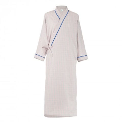 | 動きを妨げない、ゆったりとした作り。着替えがしやすく、診察時にも便利な前開き。首廻り、袖口、パンツ裾のテープの色でサイズを見分けられます。どなたにでも似合う、清潔感のある色合いのチェック柄。 |