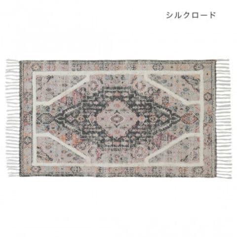 異国の地でふと立ち寄ったアンティークショップ。足元を見ると、何年も使い込まれているのに素敵な雰囲気漂う絨毯。そんなイメージからデザインされたラグマットです。くすみカラーは木彫の家具とも相性は抜群プリントとタフティングでデコレーションをしました。