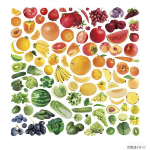 | 白い背景に多くの新鮮な果物と野菜を虹の色で配置したコラージュ写真です。食卓やキッチン、玄関先や窓際などあらゆる場所に飾って楽しめる映え素材です。1ピース1ピースにフレッシュな魅力をお届けします。 |