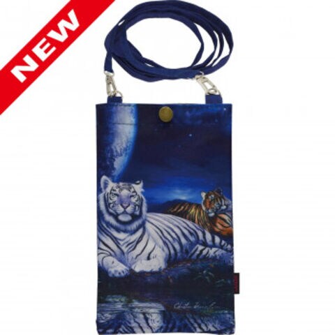 | スマホを入れて上部の金属ボタンで留めることができます。裏表に同じ柄がプリントされています。ゆったりサイズなので、大きめのスマホも収納可能! |