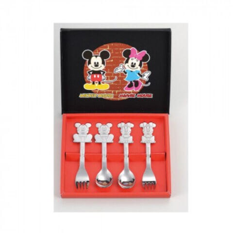 | ミッキーとミニーがちょこんと座ったデザインのカトラリー。オールステンレス製なので食洗機対応でお手入れが簡単です。 |