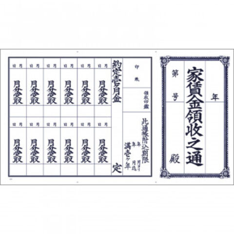 | 「家賃金領収之通(1年用)」は家賃を領収したことを証明する書面としてお使いいただける事務用品です。3つ折にして使える・レトロなデザインが特徴です。賃貸経営(貸し家・賃貸マンション)や事務に最適です。 |