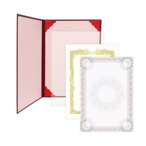 | スリムでスタイリッシュな証書保管ファイルです。2種類の証書用紙が入っており、証書とファイルを同時に準備できます。A4規格サイズ対応で、1枚収納です。付属の透明シートが証書を美しく保護します。レザー調の質感に、上品な華やかさをもつ深い落ち着いた赤色です。表彰状や認定証、修了証書、感謝状などの発行に最適です。 |