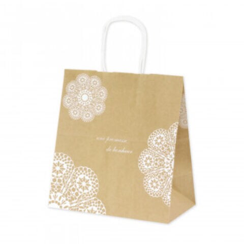 | 人気のレース柄がデザインされたナチュラルな風合いの手提げバッグ「レースィ」です。材質はナチュラルな風合いの未晒クラフト紙を使用しています。シンプルなデザインと原紙の質感を活かしたナチュラルな風合いで幅広い層に好まれます。底のマチ幅が15センチと広いので、厚みのある商品もお入れいただけます。文言の「une promesse de bonheur」はフランス語で「幸せな約束」の意味合いです。 |