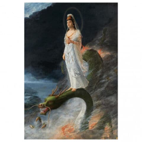 | 日本の宗教的な観音像を西洋の技術で描いた作品。架空の存在である龍をリアルに描くために犬や鶏をスケッチしたといわれています。想像を含めた様々なことがらを再構成して描いています。このように宗教などから得た着想を頭の中で組み立てて描いたものを構想画と呼び、西洋では伝統的に高尚なものとされてきました。西洋伝統の構想画を、日本伝統の画題・観音像で描いた本作。東西文化の相違と価値が絡まり生まれたものです。 |
