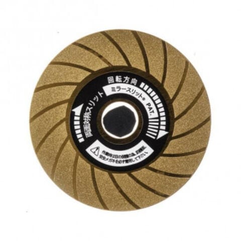 | チタンコートで3倍長持ち。ファーストマンのミラースリットRダイヤモンドディスクなら、両面対称スリット(特許)だから研磨をしても切断をしても両面のミゾが切り粉のハケを良くして目詰まりを防ぎます。両面対象スリットでまっすぐ切断でき目詰まりしにくいのも特徴です。 |