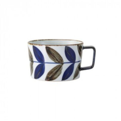 | 藍色と茶色のコントラストが目を引くリーフ柄のマグ。全体の印象を引き締めてくれる口サビや、陶器ならではの温かみもポイントです。 |