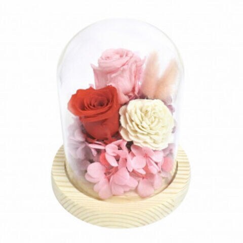 | ガラスドームで包まれたプリザーブドフラワーアレンジメントは華やかなだけでなく保護性能も優れています。本物のお花から作られていますが水やり等のお手入れ不要で、長く美しいお花をお楽しみください。 |