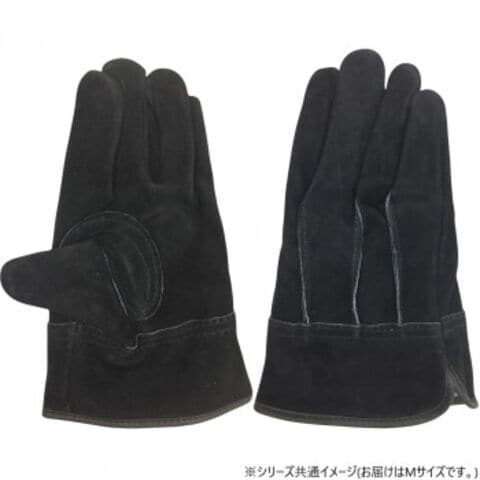 | 牛床革のバット部とショルダー部を使用したAグレード床革手袋です。しっかりと黒く染めました。内綿付で夏はさわやか、冬は暖かいです。 |