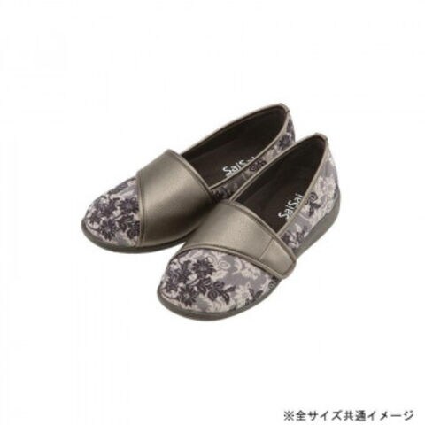 | 足を包み込むような柔らかい素材にお洒落な花柄をプリントしました。「パンプスのイイところ」と「スリッポンのイイところ」をプラスした、フィット感を調整できる万能スリッポンです。 |