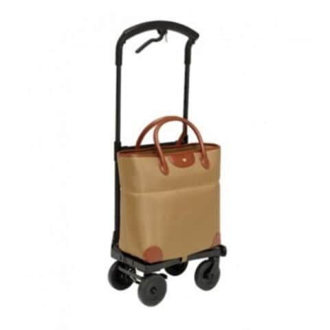 | トートバッグタイプの横押しカートです。滑らかなカーブのハンドルが手のひら全体にフィットします。手元のブレーキを掛けると、下り坂でもスピードを調節して進め、駐車ロックを掛けるとカートが動きません。キャスターが大きいので、動きが軽やかで扱いやすいです。 |