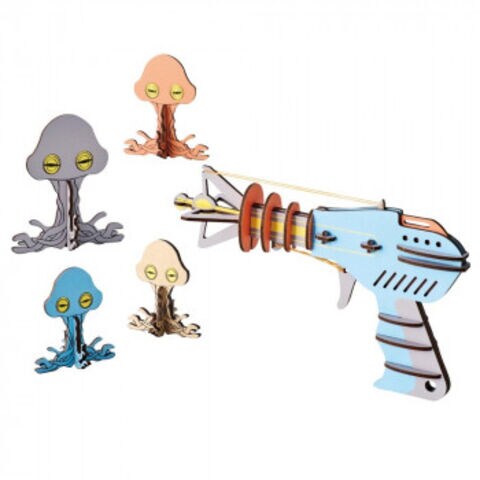| 光線銃から輪ゴムを発射して、宇宙人を倒そう!! ※商品は手作りの為、形状や色、プリントに多少のばらつきがありますのでご了承ください。 |