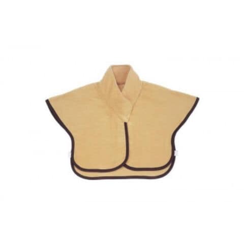 | パジャマの上から着て、肩をすっぽり包むので、寝返りを妨げません。寒い日の湯上りなど、ホームウェアとしてもお洒落。保温性が抜群。袖口に余裕があり、動きがとてもらくちんです。前の留め(写真で四角の縫い目が見えている所)はボタンではなく面ファスナー(マジック)です。 |