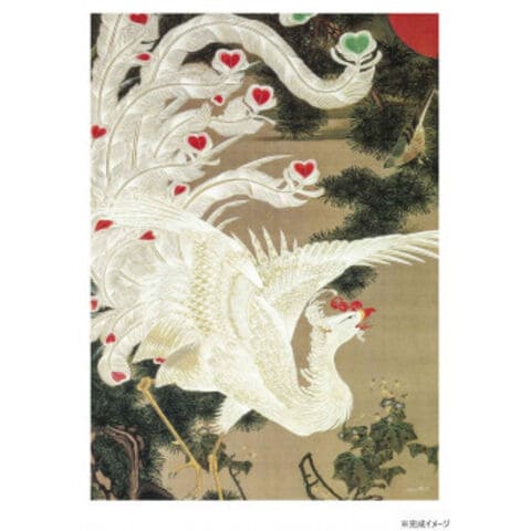 翼のハートマークのような羽根飾り、鶏冠の赤味がアクセントとして作品にメリハリを出しています。空想上の霊鳥である鳳凰をあたかも写生したような迫力を持ちます。