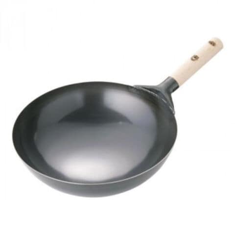 | 中華料理に使用する丸底の鉄鍋です。炒める、揚げる、煮る、蒸すなどの調理法を一つでこなす万能鍋です。片手木柄の中華鍋です。 |