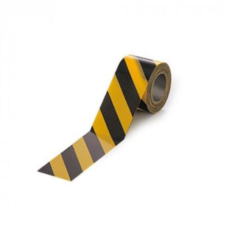 巻き付けるとトラ模様になるテープです。工事・倉庫・店舗のバックルーム等の注意、危険箇所の警戒表示に。