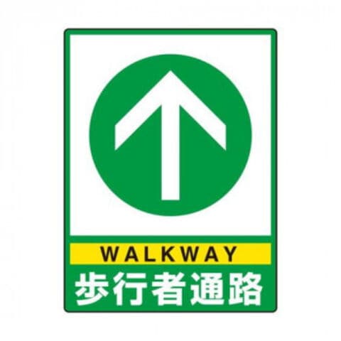 歩行者通路を明示する路面用標識です。基材に積層されたアルミニウムが凹凸面に密着します。屋外のアスファルト面や目地の深いタイル石材等にも貼付可能です。これまで塗装でしか対応できなかった場所にもご使用いただけます。