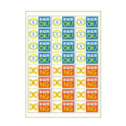 券売機や自動販売機などに貼ることで、新紙幣に対応しているかを表示するステッカーです。1シートに対応・非対応の2種類があるので、状況に合わせて貼り替えができます。しっかり貼れてきれいにはがせる強粘・再剥離タイプです。水・光・温度変化に強くて破れにくく、屋外での使用にも適しています。貼り付け後は-20度~+80度の環境下で使用可能です。