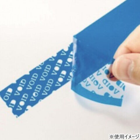 | 1度貼り付けると剥がした際に基材破壊がおきて剥がしたことがわかります。手で切れるようにカットが入っています。また、テープカッターでも切れます。両サイド各7mmずつノープリントゾーンがあります。ここは触っても青いテープが付着しません。 |