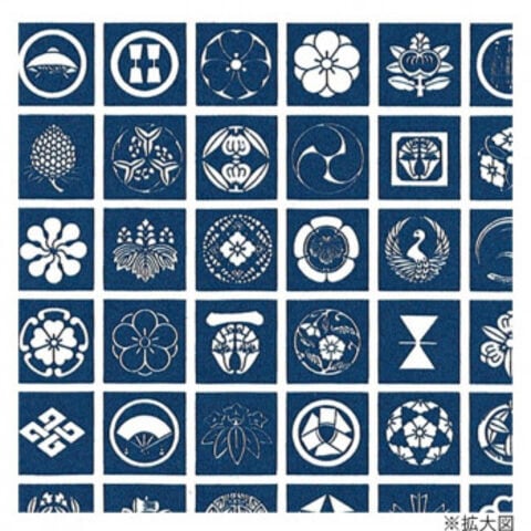| 紺地に様々な家紋が並ぶ和柄の包装紙です。 ※三つ折りの状態でポリ袋入れの商品になります。あらかじめご了承ください。 |