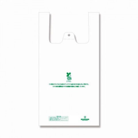 生物由来の有機資源を原料としたバイオマス成分を25%含んだレジ袋です。乳白色。食品衛生法規格基準適合商品です。