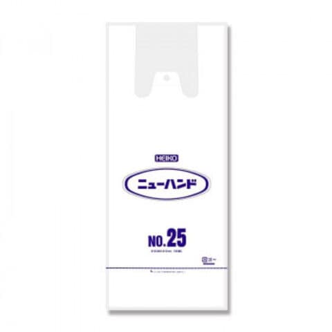 | プレーンな乳白色のレジ袋です。フックに掛けて吊り下げ、ミシン目から切り離して使用するハンガータイプ。東日本25号サイズに相当しております。食品衛生法規格基準適合商品です。 |