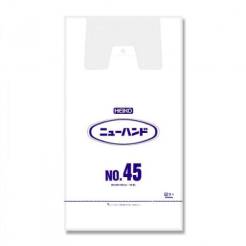 | プレーンな乳白色のレジ袋です。フックに掛けて吊り下げ、ミシン目から切り離して使用するハンガータイプ。東日本45号サイズに相当しております。食品衛生法規格基準適合商品です。 |