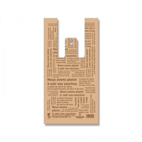 | 生物由来の有機資源を原料としたバイオマス成分を25%含んだレジ袋です。ナチュラルでシンプルな仏語の落ち着きのあるデザイン。本体1枚1枚にパッケージとは異なるJANコードを印字してあります。 |