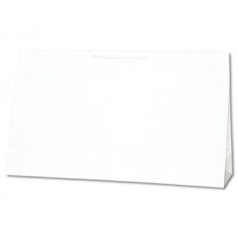 | 袋本体の穴に通した手紐を結んで取り付けたタイプの手提げ紙袋です。口を内側に折り返し、ボール紙を挟んで強度を持たせています。正面幅が最大級で、かつマチもゆったりした大容量の横型サイズ。毛布やコートなどのお持ち帰り用として最適です。汎用性の高い白無地。 |