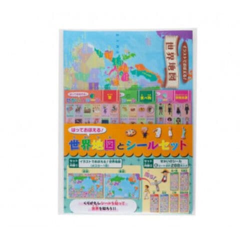世界地図ポスター1枚と、世界の食べ物、 名産品、 祭、 名所、人物、民族衣装の6種類のシールが入っている学習セットです。世界地図ポスターに世界の国の名産品や名所、食べ物のイラストのシールを貼って、お子様が楽しみながら世界の国を覚えられます。また、色々な国を知る事で、世界の国々への関心が高まります。お子様への新学期、新入学祝いのプレゼントや、家庭学習にもおすすめです。貼って剥がせる弱粘着シールです。