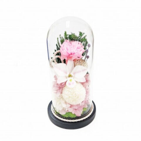 | ガラスドームに包まれた、お供えプリザーブドフラワーアレンジメント。プリザーブドフラワーなのでお水やりなどの手間が不要で、見た目に高級感があるだけでなく保護性能も高いため、さらに長期間お花を美しい状態に保ちます。 |