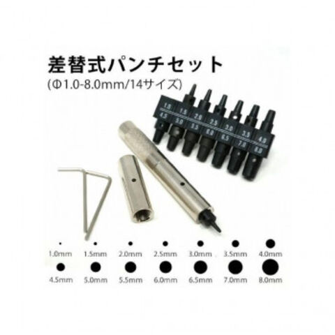 | セット内容 | 直径1.0/1.5/2.0/2.5/3.0/3.5/4.0/4.5/5.0/5.5/6.0/6.5/7.0/8.0mmの14サイズの差替式パンチ、専用レンチ2本 |