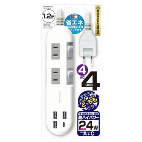 電源タップ 4AC 4USB 3A+1C 24W 1.2m リバーシブル SW WH AC-022