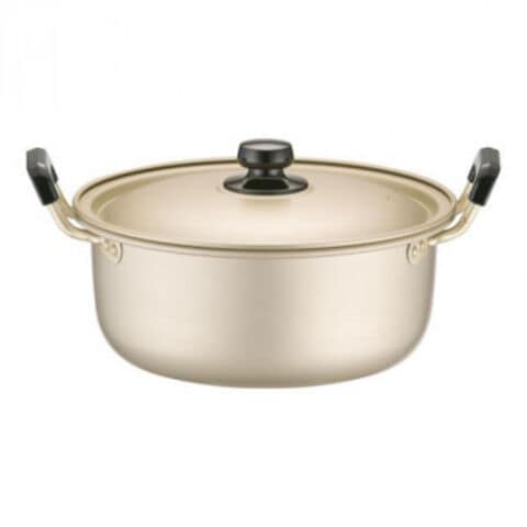 | 昔ながらの金色が美しい硬質アルミ製両手鍋です。家庭用から業務用、防災炊き出しまで幅広く活用される定番アイテムです。 |