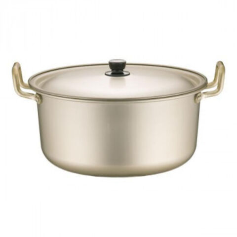 | 昔ながらの金色が美しい硬質アルミ製両手鍋です。家庭用から業務用、防災炊き出しまで幅広く活用される定番アイテムです。 |