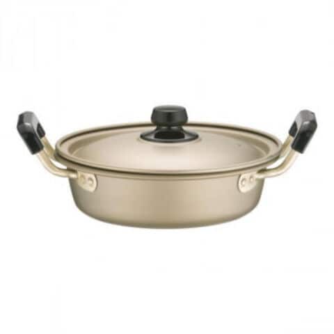 光沢のある金色が美しい硬質アルミ製の浅型両手鍋です。昔ながらの調理器具で、魚の煮付けや煮物が美しく仕上がり、家庭から業務用、防災用まで幅広く活用されます。